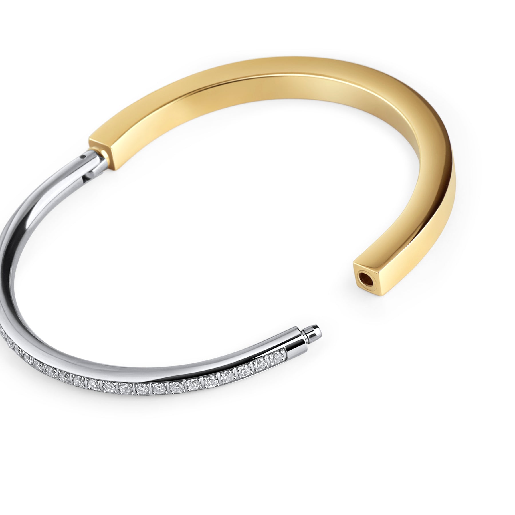 For the woman who loves to combine elegance and modernity, this rectangular bracelet adorned with sparkling stones is a true statement piece. It delicately enhances the wrist while expressing a refined and bold style.