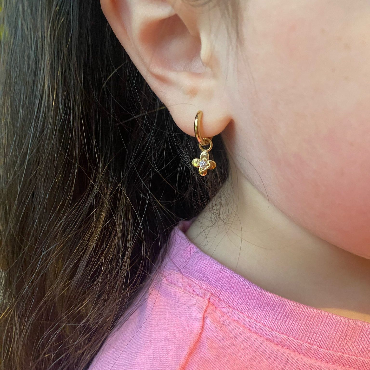 Kids flower pendant huggie earrings for sensitive skin boucles oreilles enfant fille breloque fleur acier inoxydable peau sensible hypoallergènes
